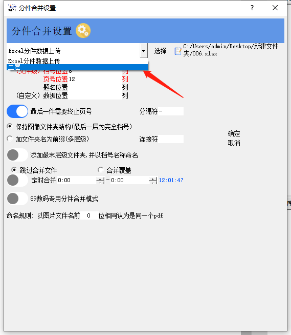 分件合并需要上傳Excel分件數(shù)據(jù),可以選擇Excel上傳或者是選擇檔案門類中“二層”的案卷目錄。