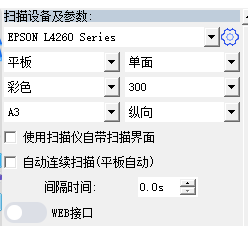 選擇掃描儀、掃描儀的掃描模式、單面/雙面、色彩類型、分辨率(dpi)、幅面、橫縱,也可以使用掃描儀自帶界面,是用平板自動(dòng)掃描、自動(dòng)掃描的間隔時(shí)間,web接口