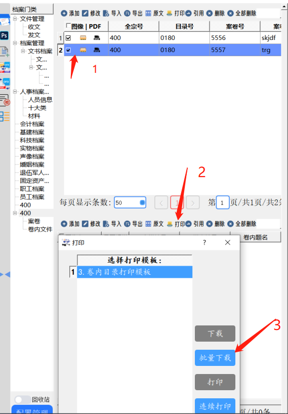 注意:在打印卷內(nèi)目錄的時(shí)候先點(diǎn)擊選擇需要打印的案卷,再點(diǎn)擊卷內(nèi)界面的打印,就會(huì)打印已選擇的案卷的卷內(nèi)目錄,可以選擇多個(gè)案卷進(jìn)行批量打印。