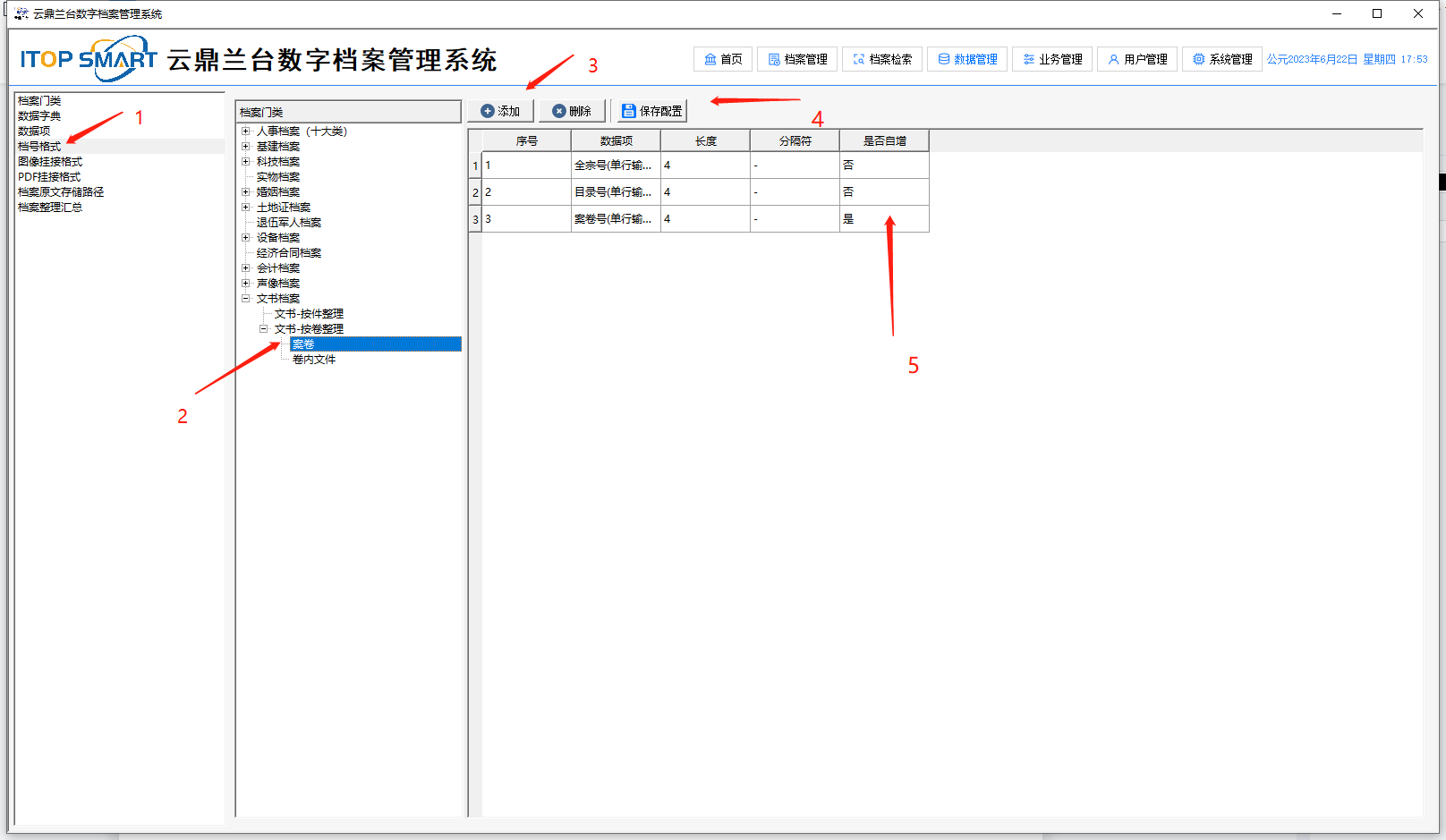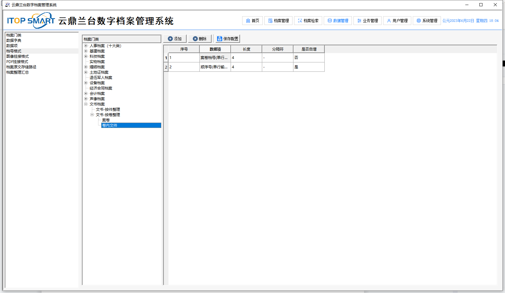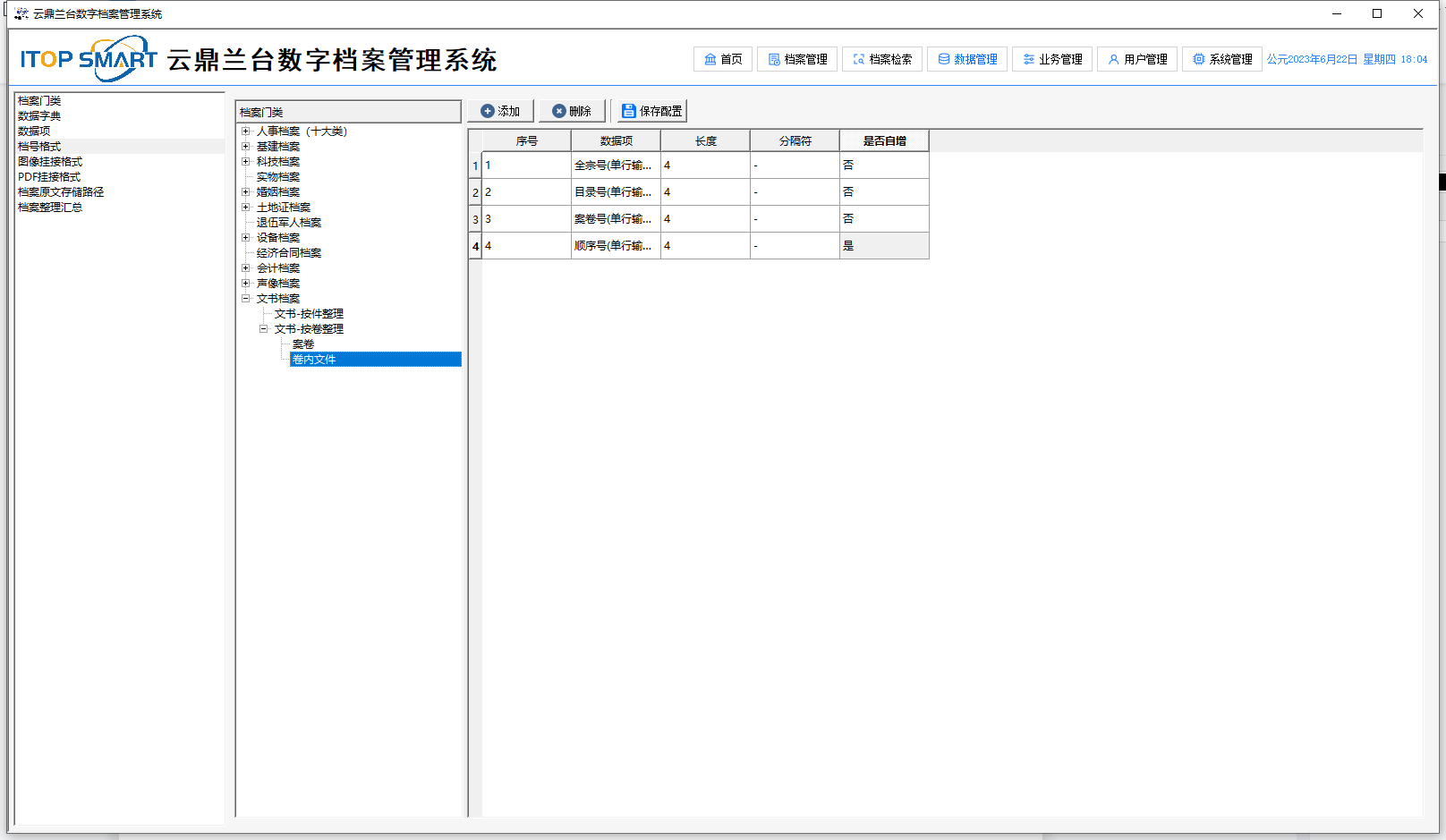 1,點(diǎn)擊檔號(hào)格式,選擇需要配置檔號(hào)格式的檔案門類,點(diǎn)擊添加進(jìn)行檔號(hào)格式配置,案卷級(jí)檔案的案卷配置案卷檔號(hào),案卷號(hào)是否自增選擇是,卷內(nèi)文件配置卷內(nèi)檔號(hào),順序號(hào)或件號(hào)是否自增選擇是。一文一件級(jí)檔案只需配置檔號(hào),件號(hào)的是否自增選擇是。記得配置完成后一定要點(diǎn)擊保存配置。(檔號(hào)的格式以實(shí)物為準(zhǔn),且檔號(hào)組成必須為已添加的數(shù)據(jù)項(xiàng))