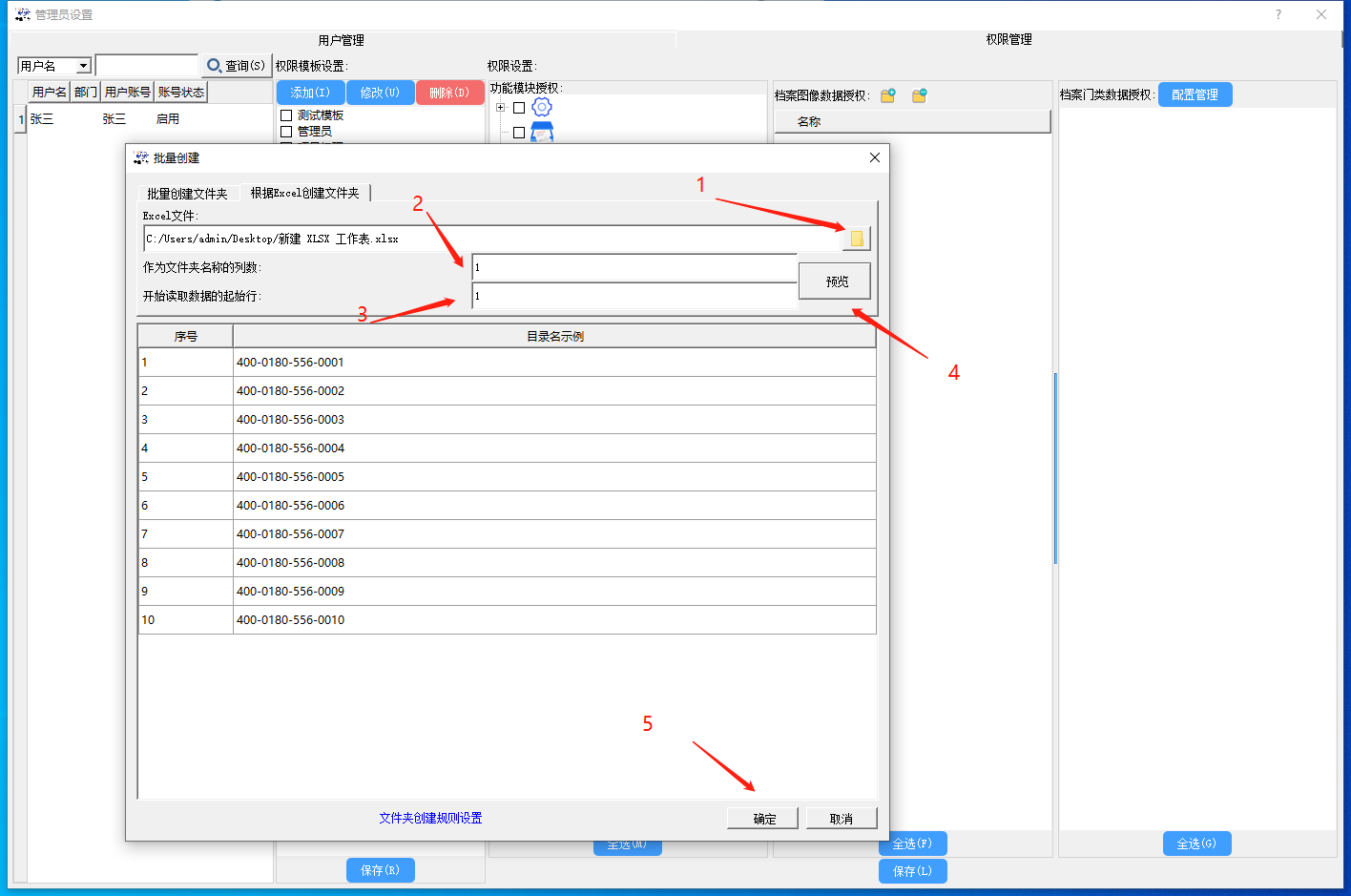 (6)點(diǎn)擊excel文件空白欄后面的小文件夾圖標(biāo)選擇提前建立的完全檔號(hào)excel表格,作為文件夾名稱的列數(shù)選擇表格內(nèi)完全檔號(hào)所在的列數(shù),開始讀取數(shù)據(jù)的起始行選擇完全檔號(hào)起始行所在的行數(shù),點(diǎn)擊預(yù)覽,查看目錄行示例是否正確,如若正確,點(diǎn)擊確定開始創(chuàng)建文件夾。