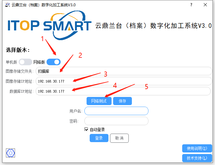 (1),點(diǎn)擊選擇網(wǎng)絡(luò)版,圖像存儲(chǔ)文件夾輸入已共享的文件夾名稱,圖像存儲(chǔ)IP地址輸入文件夾所在電腦的IP地址,數(shù)據(jù)庫IP地址選擇建立網(wǎng)絡(luò)版數(shù)據(jù)庫的電腦的IP地址,點(diǎn)擊網(wǎng)絡(luò)測(cè)試看是否鏈接成功。