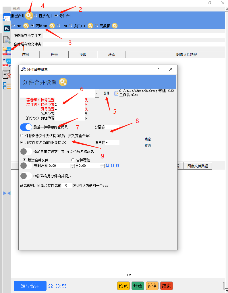 (1)點(diǎn)擊批量合并模塊,合并一文一件檔案就選擇直接合并,合并案卷級(jí)檔案就選擇分件合并,然后選擇合并為雙層pdf或者是元數(shù)據(jù),點(diǎn)擊設(shè)置按鍵,選擇圖片對(duì)應(yīng)的卷內(nèi)目錄excel文件(可由著錄界面直接導(dǎo)出),然后再分別填入excel文件中案卷級(jí)檔號(hào),文件級(jí)檔號(hào),頁號(hào)所在的列數(shù),打開最后一頁需要終止頁號(hào)的選項(xiàng),并且為其添加分隔符為“-”,然后根據(jù)自己的原圖像的儲(chǔ)存文件路徑的最后一級(jí)是否為完全檔號(hào),去選擇是否保持文件夾結(jié)構(gòu),所有選項(xiàng)完成后,點(diǎn)擊確認(rèn)進(jìn)行保存,然后再選擇圖像的儲(chǔ)存路徑(注意,文件夾選擇為完整檔號(hào)結(jié)構(gòu)第一個(gè)數(shù)據(jù)項(xiàng)的上一層文件夾),選擇合并數(shù)據(jù)的儲(chǔ)存路徑,點(diǎn)擊預(yù)覽看是否能夠預(yù)覽,若不能則上述步驟出現(xiàn)錯(cuò)誤,需要檢查,若能預(yù)覽出來,測(cè)點(diǎn)擊開始,開始合并。