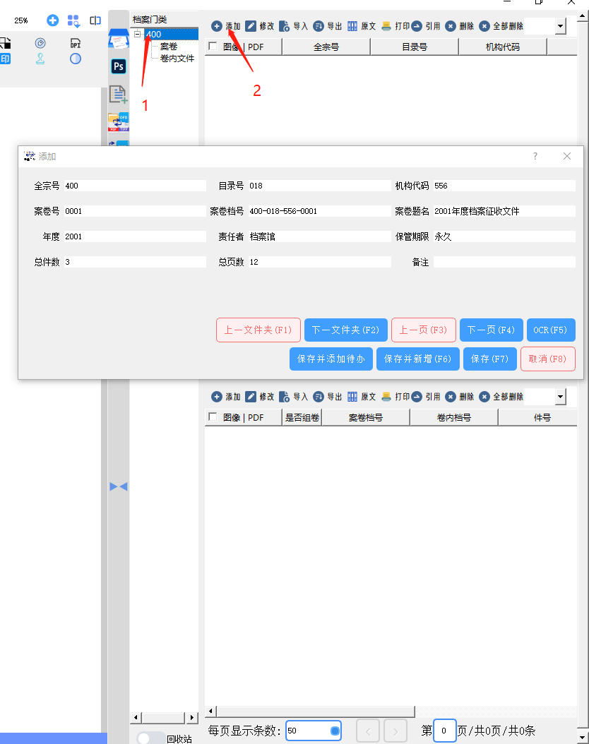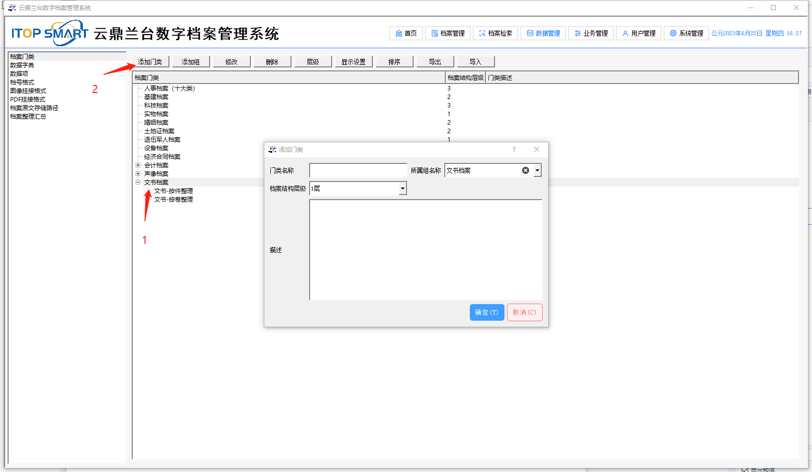 (1),點(diǎn)擊選擇門類,點(diǎn)擊添加可以為此門類添加案卷