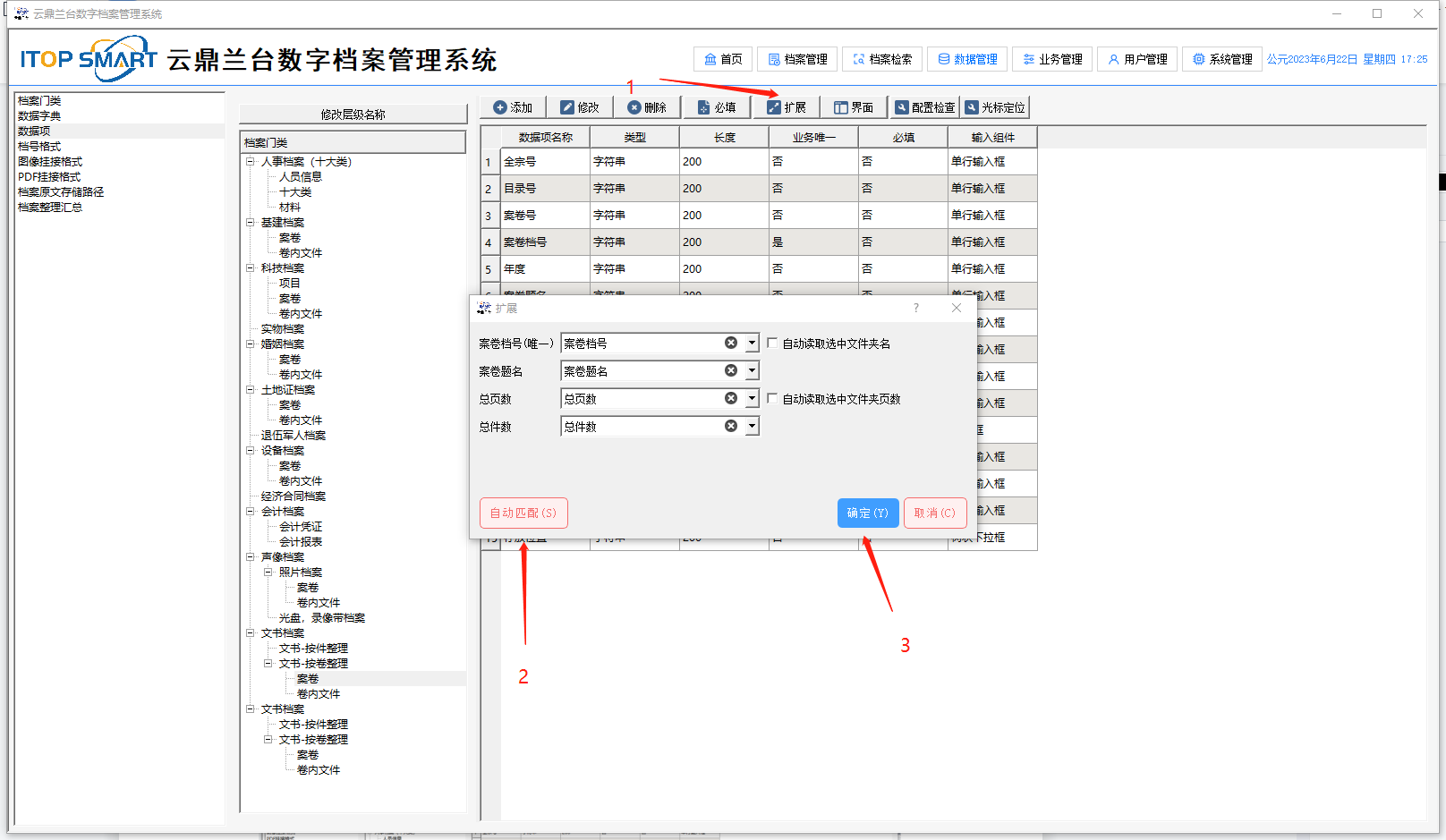 配置完成后點(diǎn)擊擴(kuò)展,在彈出界面點(diǎn)擊自動(dòng)匹配進(jìn)行拓展,若因數(shù)據(jù)項(xiàng)名稱差異配匹配失敗可手動(dòng)選擇,匹配完成后點(diǎn)擊確定,案卷數(shù)據(jù)相配完成。