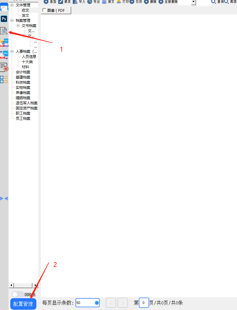 (1)點(diǎn)擊檔案門類數(shù)據(jù)授權(quán)后的配置管理進(jìn)入數(shù)字檔案管理系統(tǒng),