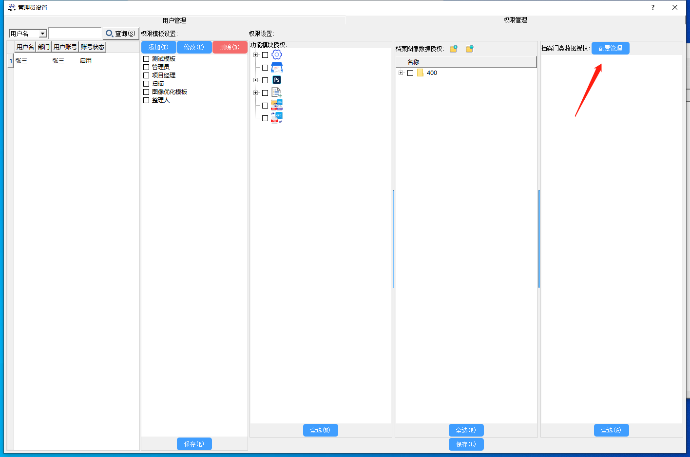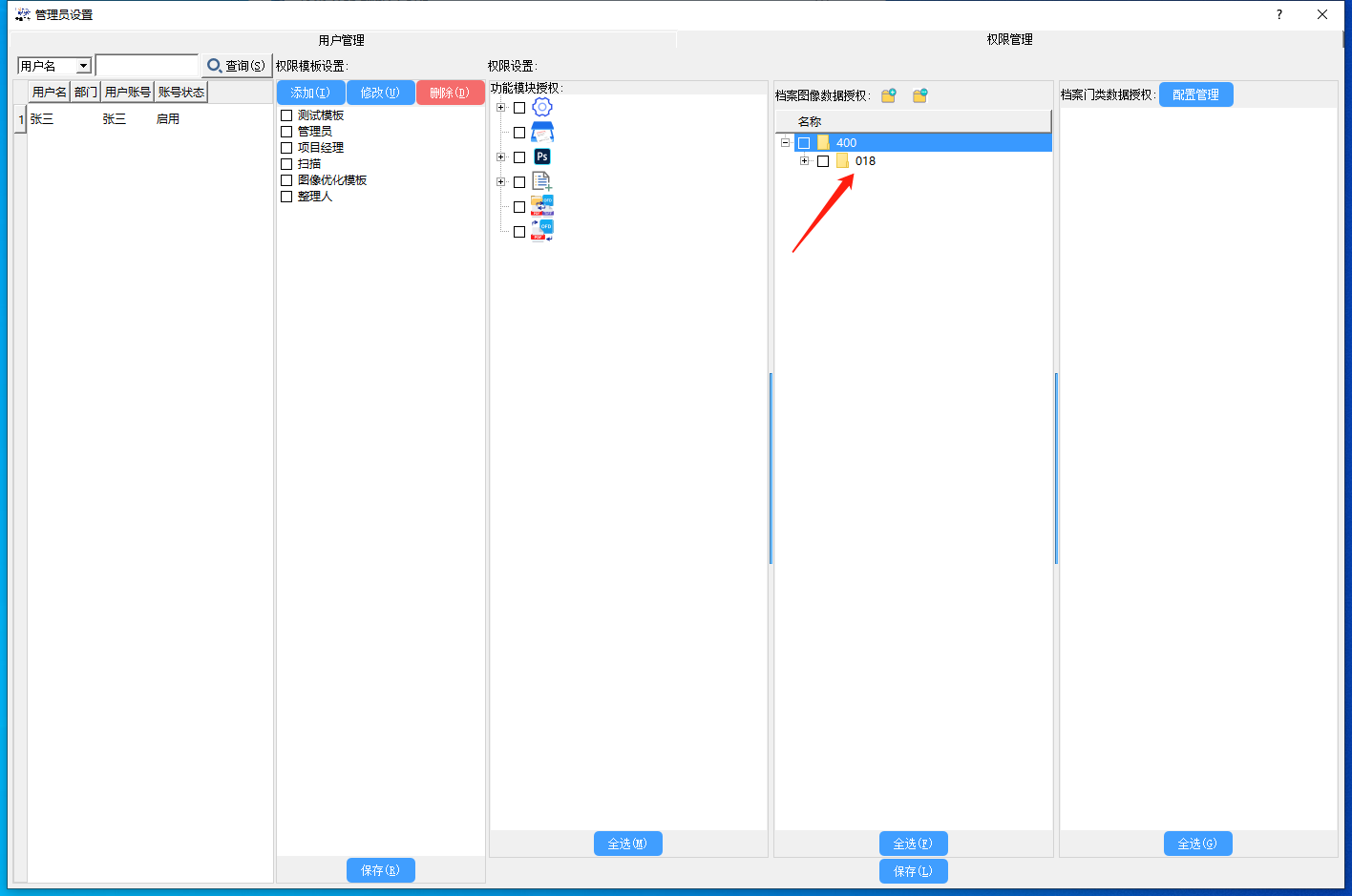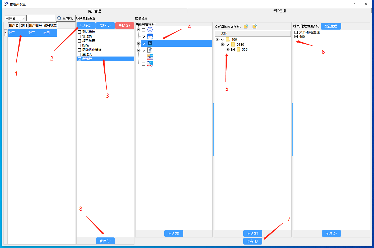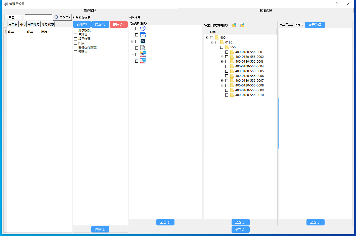 在管理員設(shè)置界面,點(diǎn)擊勾選用戶,在權(quán)限模板設(shè)置欄點(diǎn)擊添加為其添加權(quán)限模板,權(quán)限模板可以直接套用已存在的模板(模板包括功能模塊授權(quán),檔案圖像數(shù)據(jù)授權(quán),檔案門類數(shù)據(jù)授權(quán)的權(quán)限分配設(shè)置),也可自己添加新模板:點(diǎn)擊添加,添加新權(quán)限模板,選擇新權(quán)限模板,在功能模塊授權(quán)欄,檔案圖像數(shù)據(jù)授權(quán)欄和檔案門類數(shù)據(jù)授權(quán)欄為其分配權(quán)限,分配完成后,先點(diǎn)擊右側(cè)保存鍵保存模板的權(quán)限分配選擇,再點(diǎn)擊左側(cè)保存鍵保存賬號(hào)的模板選擇。