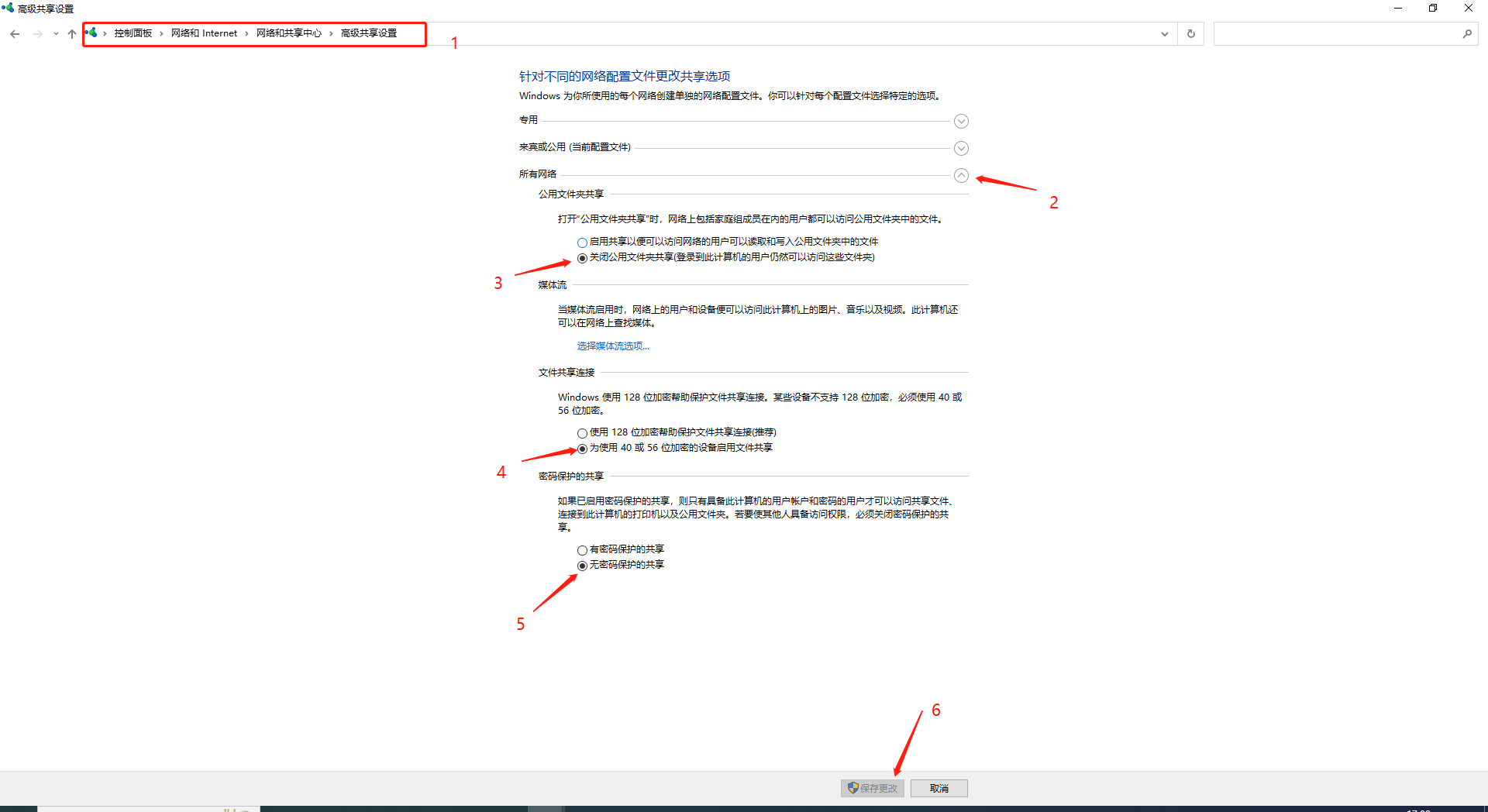 (4)打開以下路徑:控制面板\網(wǎng)絡(luò)和 Internet\網(wǎng)絡(luò)和共享中心\高級(jí)共享設(shè)置,點(diǎn)開所有網(wǎng)絡(luò)下拉選項(xiàng),點(diǎn)擊選擇以下選項(xiàng),保存更改。