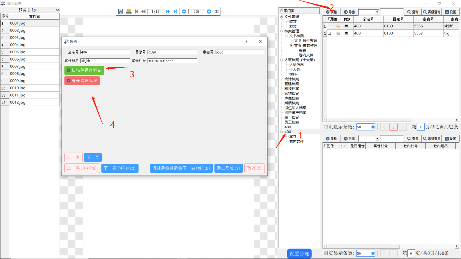 通常在掃描與著錄完成后,我們需要的掃描與著錄的結(jié)果進(jìn)行質(zhì)檢,點(diǎn)擊質(zhì)檢模塊進(jìn)入質(zhì)檢界面,點(diǎn)擊選擇一個(gè)門類,點(diǎn)擊質(zhì)檢開始對(duì)此門類的質(zhì)檢,掃描件錯(cuò)誤標(biāo)記標(biāo)記掃描錯(cuò)誤的原圖,著錄錯(cuò)誤標(biāo)記標(biāo)記著錄錯(cuò)誤的條目。