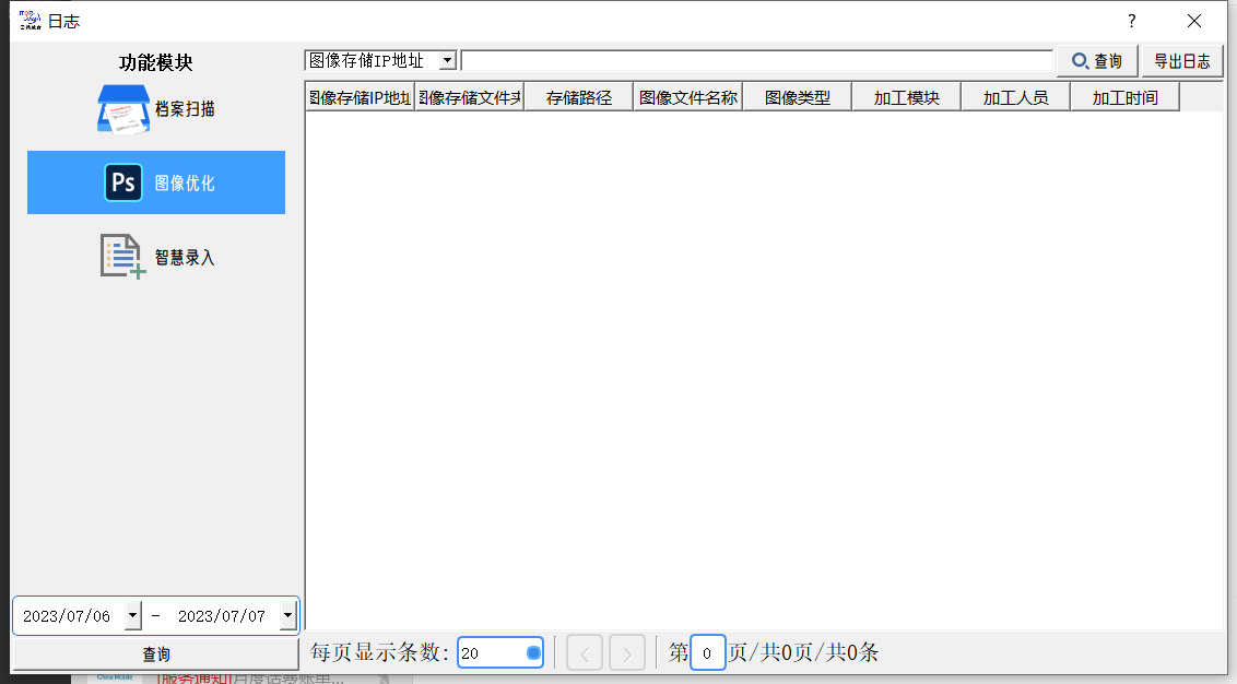 (3)工作日志管理:點(diǎn)擊登陸界面的齒輪鍵,點(diǎn)擊彈出界面的工作日志管理,點(diǎn)擊登錄管理員賬號(hào)。這里可以對(duì)各個(gè)功能模塊的加工情況進(jìn)行輔助管理,查詢數(shù)據(jù)加工記錄。