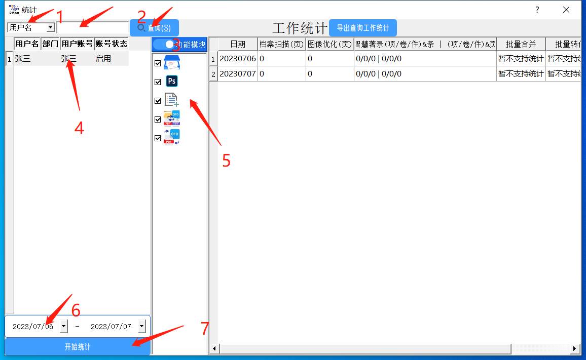 (2),工作量統(tǒng)計(jì):點(diǎn)擊登錄界面左下角的齒輪,在彈出界面點(diǎn)擊工作量統(tǒng)計(jì),登錄管理員賬號(hào),點(diǎn)擊選擇查詢條件,輸入關(guān)鍵詞,點(diǎn)擊查詢出現(xiàn)所要查找的用戶,點(diǎn)擊選擇用戶,點(diǎn)擊選擇所要查詢的工作模塊,選擇要查詢的日期,點(diǎn)擊開始統(tǒng)計(jì),開始統(tǒng)計(jì)工作量。