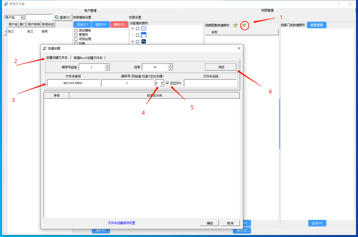 (4)點(diǎn)擊彈出界面的批量創(chuàng)建文件夾,填入文件夾順序的起始號(hào)和結(jié)束號(hào),輸入文件夾前綴(文件夾前綴決定新創(chuàng)建的文件夾的層級(jí)),選擇順序號(hào)的位數(shù),并決定是否空位補(bǔ)零。點(diǎn)擊預(yù)覽,查看目錄名示例是否正確,若正確,點(diǎn)擊確定完成創(chuàng)建。