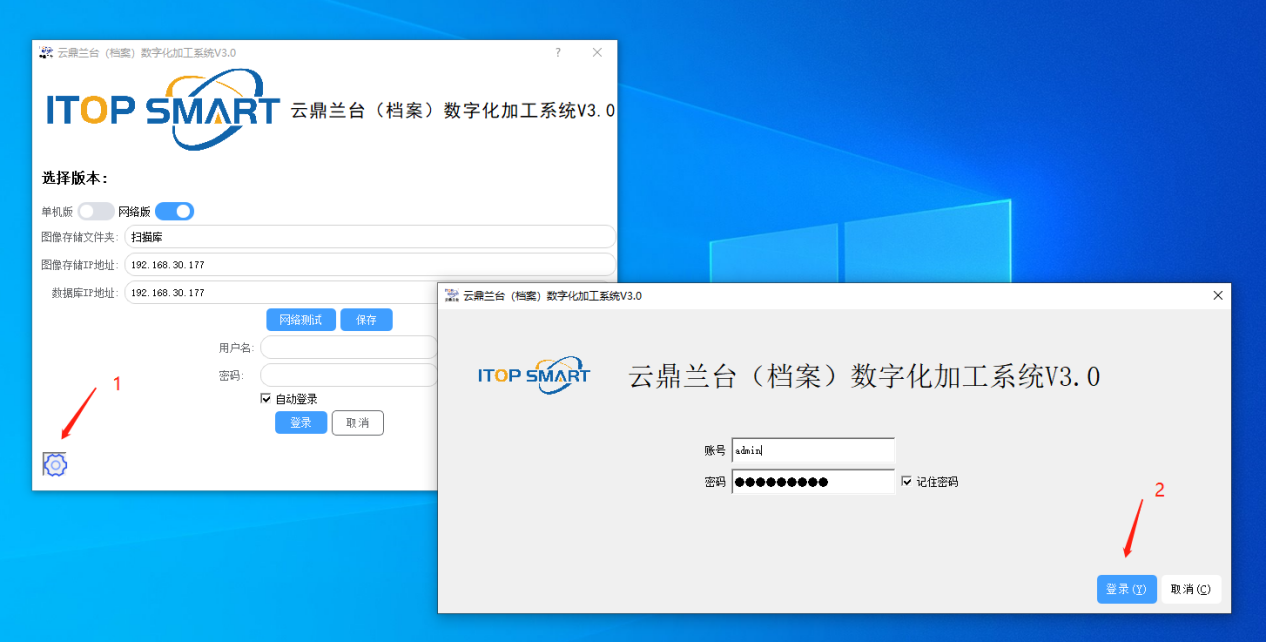 (2)點(diǎn)擊登陸界面左下角的設(shè)置按鍵,在彈出界面選擇點(diǎn)擊進(jìn)入管理員賬號(hào)登錄,彈出管理員賬戶登陸界面,點(diǎn)擊登錄(默認(rèn)賬號(hào):admin,默認(rèn)密碼:itopsmart)。