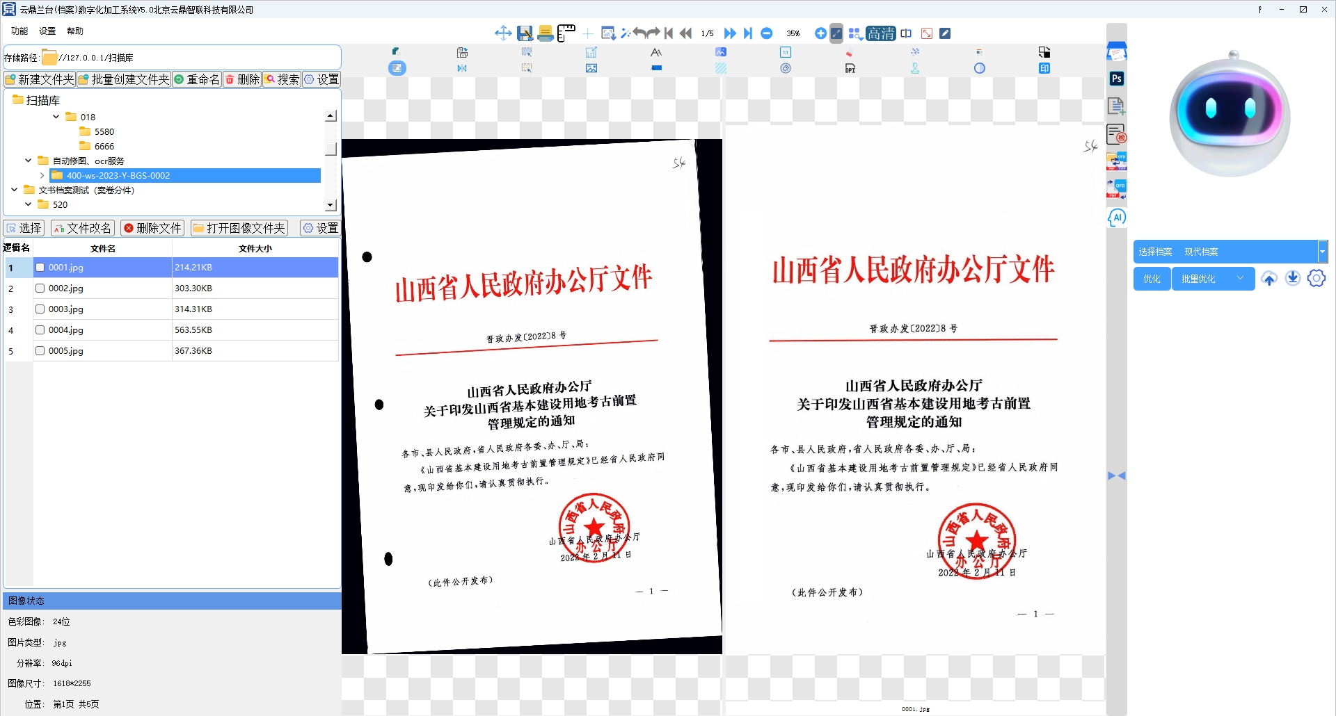 快速處理:云鼎蘭臺AI自動修圖系統(tǒng)采用先進的深度學習算法,能夠自動識別并處理檔案圖像中的常見問題,如去除黑邊、自動糾偏、陰影消除等,無需人工干預(yù),從而極大地提高了處理速度。